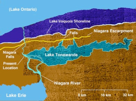 Turn time back 11,500 years and look down on western New York. Then more slowly wind forward again perhaps a hundred years at a time. You'll see the last of the half-mile thick Wisconsonian ice sheet retreat through the area. First the melting glacier will create Lake Iroquois, the beginning of what will later become Lake Ontario. But then as the glacier backs still further to the north and the water level drops, a smaller lake will form between two east-west ridges, the Niagara escarpment and the Onondaga escarpment. That long shallow pond, rarely more than thirty feet deep and a few miles wide but extending all the way from Lewiston east to Holley, was Lake Tonawanda.